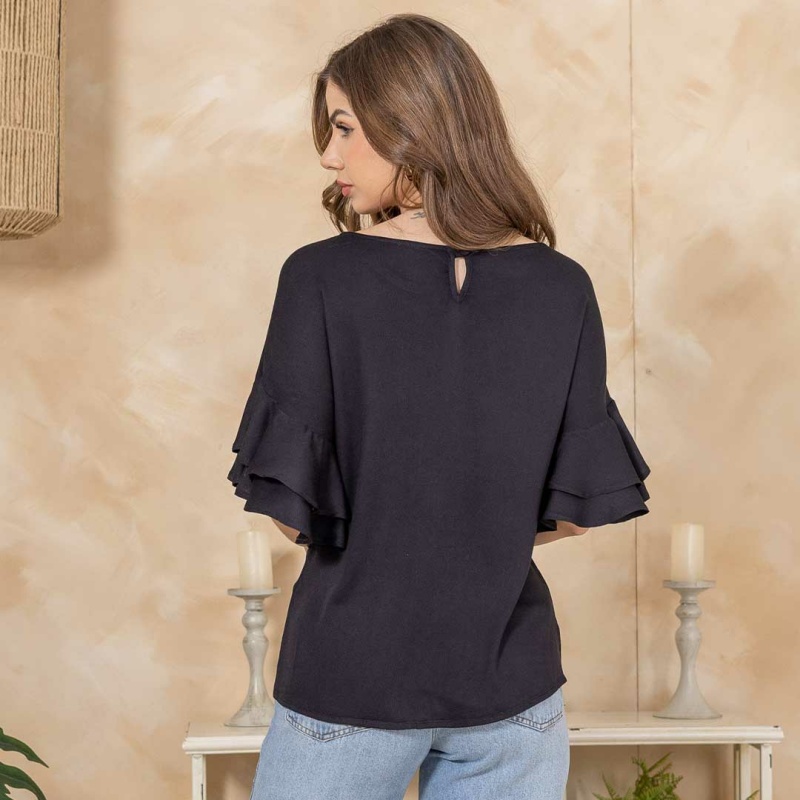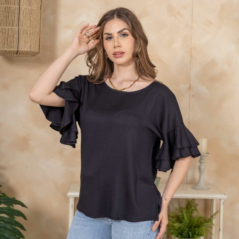 Esta blusa negra de manga corta se caracteriza por un diseño elegante con detalles en las mangas que la hacen destacar. Las mangas cuentan con volantes que le aportan un toque romántico y femenino, añadiendo volumen y movimiento al diseño. La blusa tiene un escote redondo sencillo, lo que equilibra el estilo de las mangas y crea una apariencia sofisticada sin ser recargada.