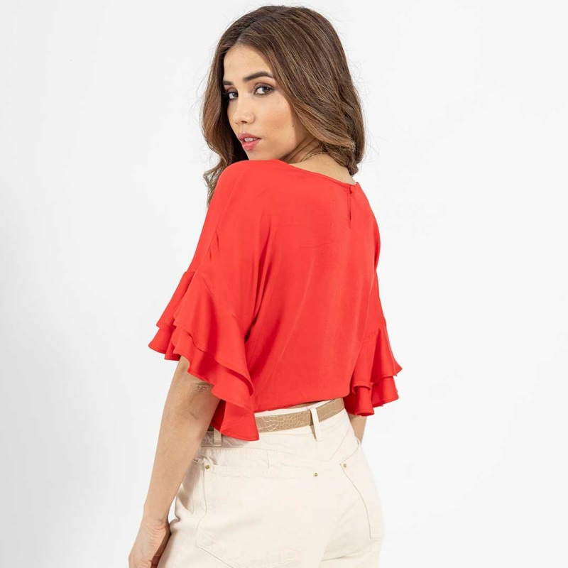 Esta blusa es una pieza llamativa y elegante, diseñada para añadir un toque de sofisticación y estilo a cualquier atuendo. Con volados delicados en las mangas, ofrece una mezcla ideal de confort, flexibilidad y un ajuste favorecedor. Estos detalles en las mangas aportan un toque de sofisticación y elevan el diseño general de la blusa.