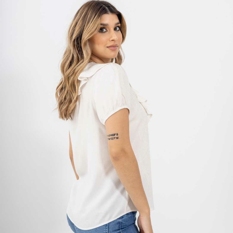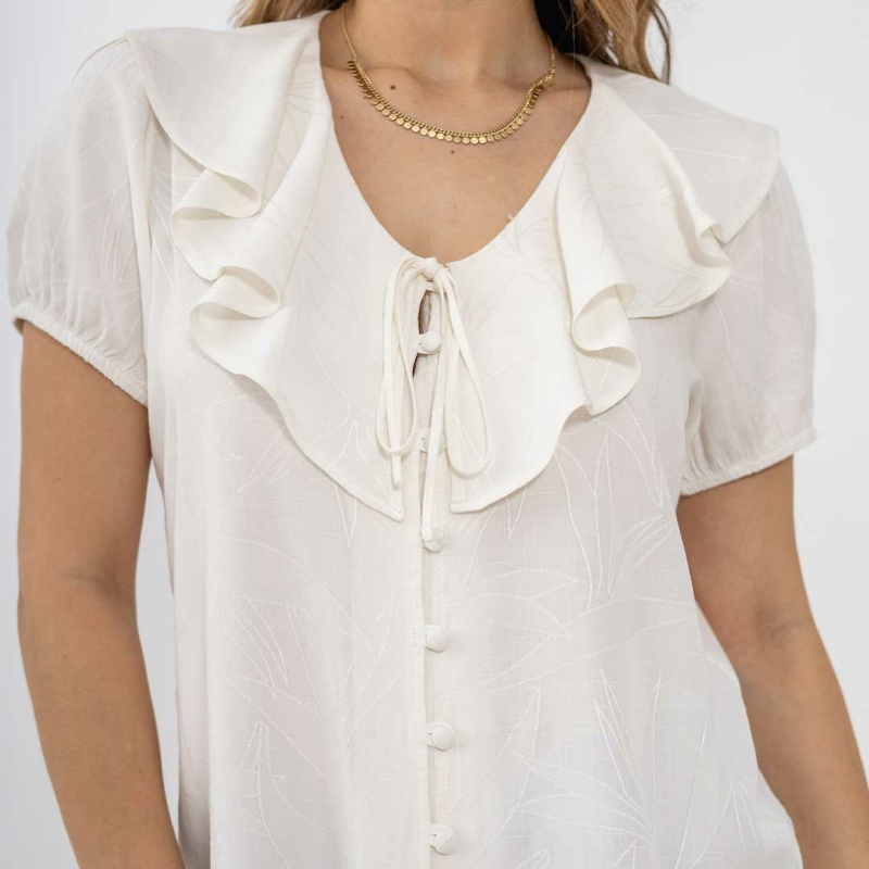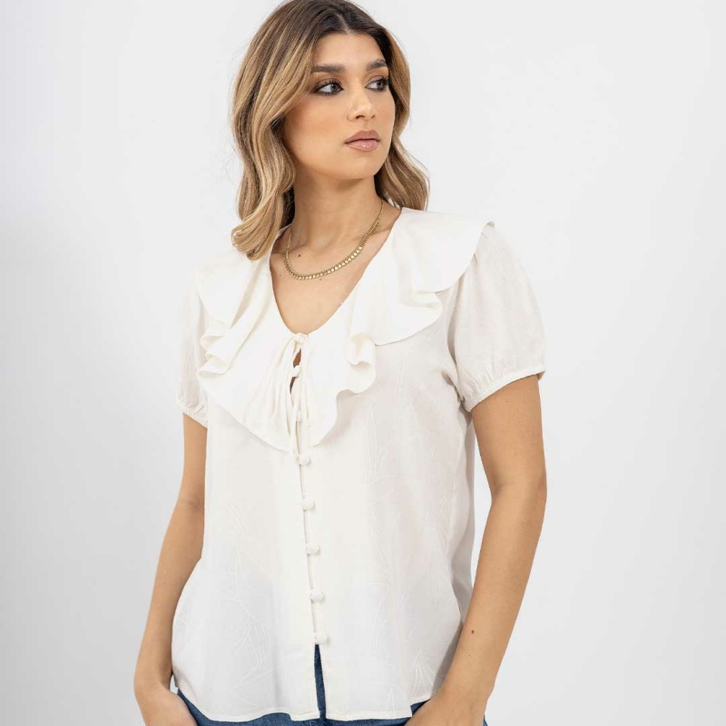 Esta blusa con solapa en color marfil es una pieza sofisticada y versátil que se adapta perfectamente a diversas ocasiones, desde un día en la oficina hasta una salida casual. Su diseño clásico asegura que sea una pieza que se mantenga en el guardarropa durante muchas temporadas.