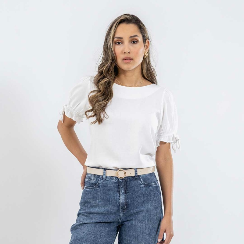 Esta elegante blusa blanca es una prenda versátil que combina comodidad y estilo. Su diseño cuenta con un detalle de goma en las mangas, que no solo añade un toque moderno, sino que también proporciona un ajuste cómodo y seguro.