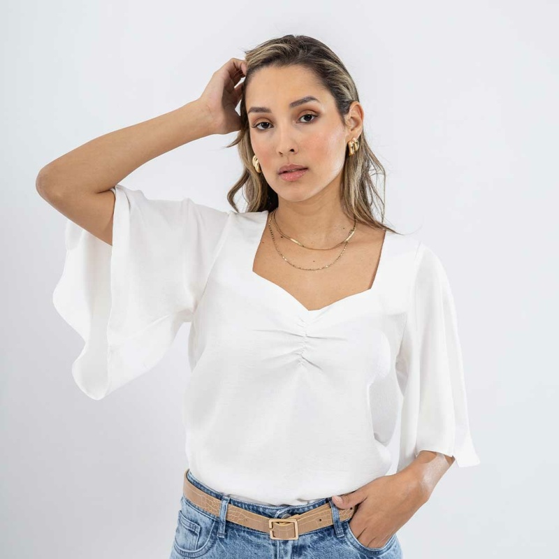 El diseño de esta blusa se centra en detalles delicados y favorecedores. Su escote cuadrado enmarca el cuello y los hombros de forma elegante, mientras que el fruncido central añade un toque sutil que resalta el busto sin perder la esencia de una pieza clásica. Las mangas amplias y sueltas se extienden suavemente hasta el codo, brindando un toque de movimiento y gracia.