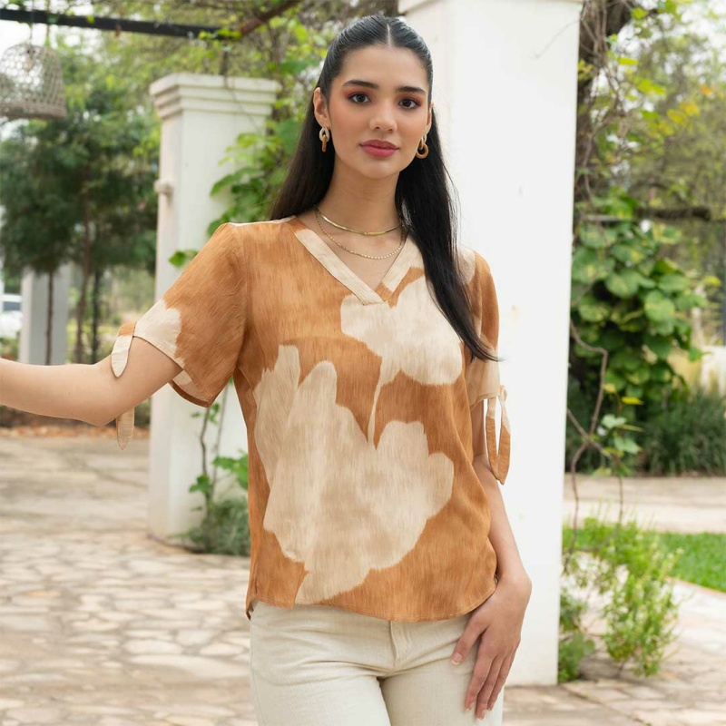 Esta blusa es una prenda versátil y elegante, ideal para cualquier ocasión, la blusa tiene un corte relajado que favorece diferentes tipos de siluetas. Uno de los aspectos más destacados de esta blusa son los lazos en las mangas, que añaden un toque distintivo y juguetón.