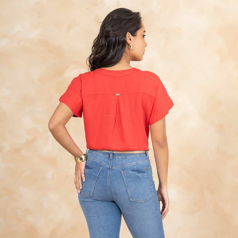 Una blusa de mangas cortas es una prenda fresca, ligera y con un toque vibrante que aporta energía al atuendo. El color rojo resalta por su intensidad y calidez, siendo ideal para ocasiones tanto casuales como más sofisticadas.
