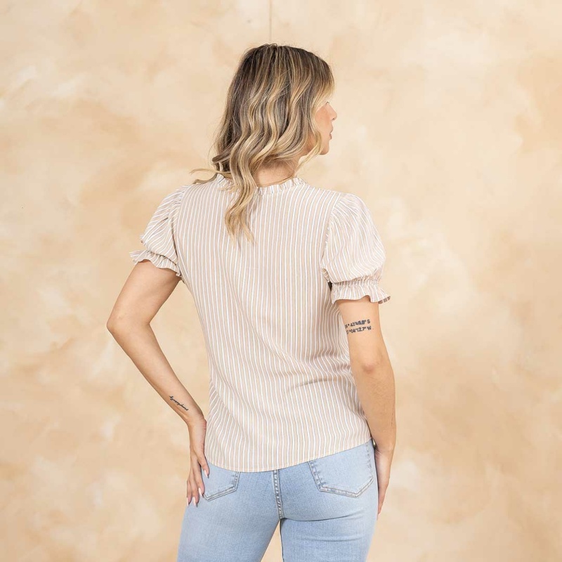 El color beige de la blusa es suave y neutro, lo que lo convierte en una base versátil que se puede combinar fácilmente con una variedad de colores y estilos. Las rayas en tonos más claros de beige o marrón añaden una dimensión sutil al diseño, creando un patrón atemporal que aporta dinamismo sin ser demasiado llamativo.