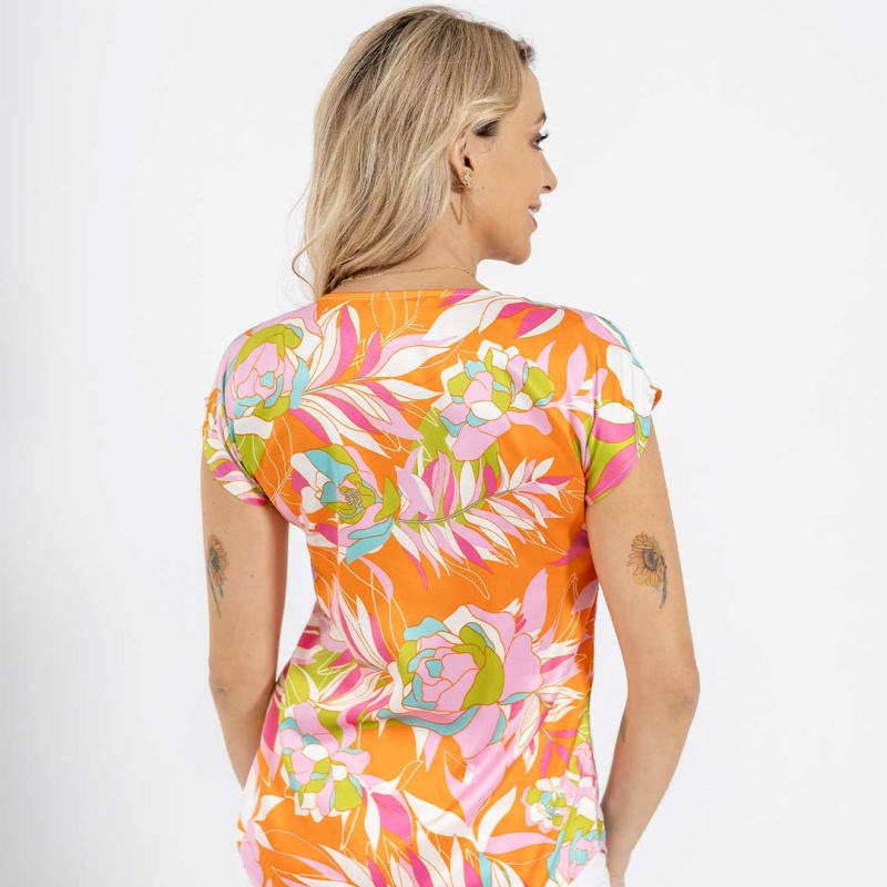 Color: El estampado moderno que acompaña al color naranja añade un toque único, creando un efecto visual atractivo que capta la atención. Ya sea combinada con jeans, faldas o shorts, esta blusa se adapta a diferentes estilos, aportando siempre un aire fresco y desenfadado.