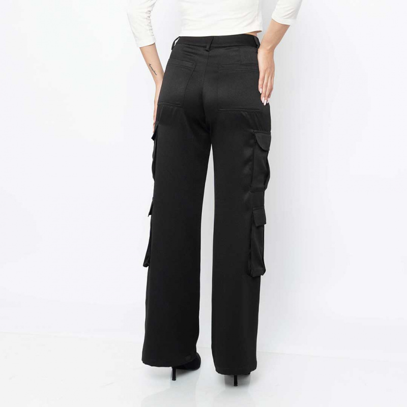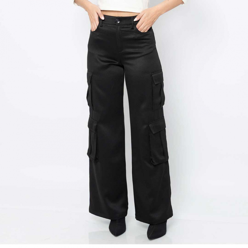 Este pantalón cargo satinado en color negro combina funcionalidad y estilo moderno en una prenda versátil y elegante, tiene un diseño cargo clásico, con bolsillos amplios en las piernas. El pantalón ofrece una apariencia sofisticada con un acabado satinado que aporta un toque de lujo y distinción.