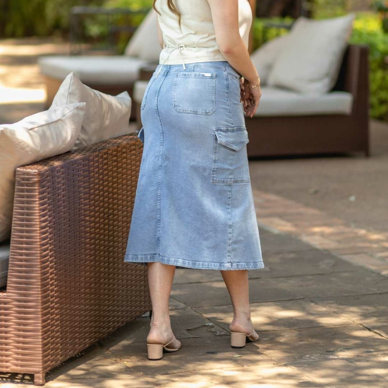 La pollera cargo shape de jeans es una prenda de corte moderno que combina el estilo utilitario de los pantalones cargo con un diseño femenino y ajustado. Esta pollera se caracteriza por su silueta estilizada y cómoda, ideal para quienes buscan un look casual con un toque de funcionalidad y estilo.