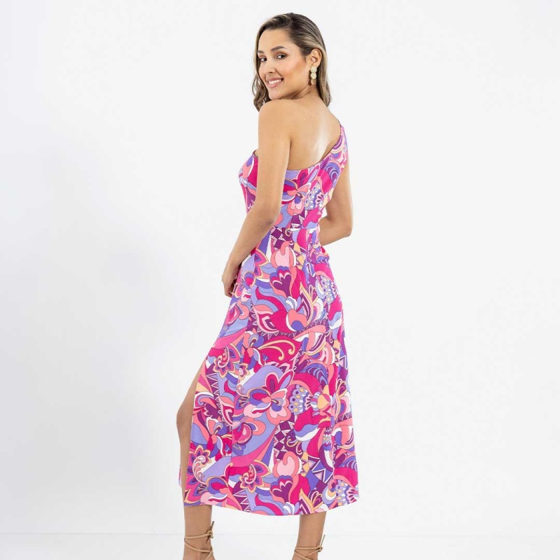 Este vestido presenta un diseño moderno y vibrante, ideal para eventos casuales o semi-formales. Su color predominante es el rosa, con un estampado abstracto que combina tonos de púrpura, lila, fucsia y detalles en blanco, dándole un aspecto alegre y femenino