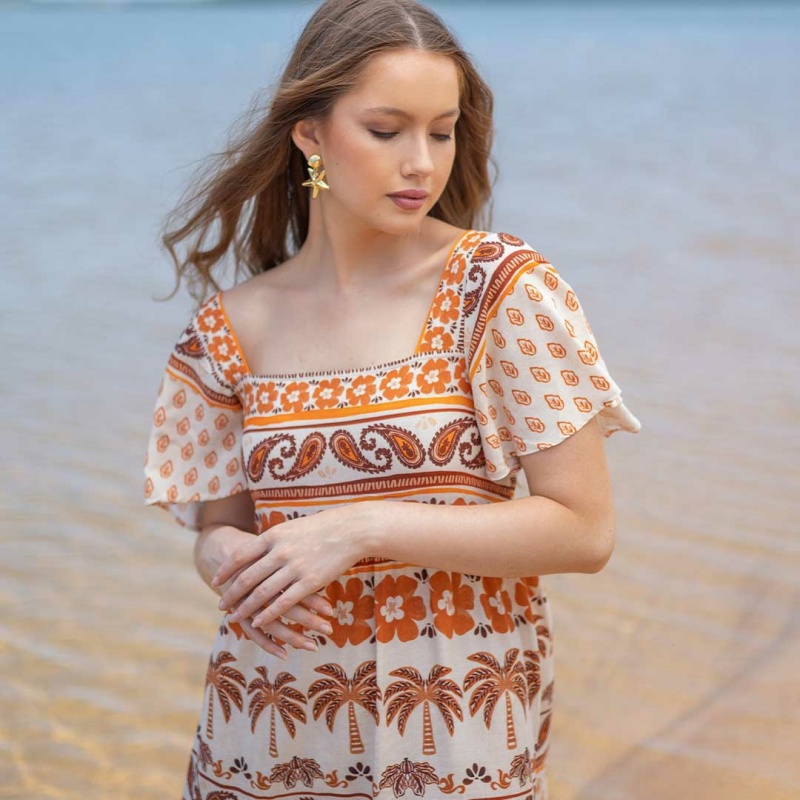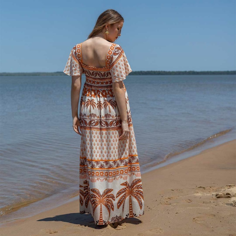 El color marfil, un tono suave y neutro, da al vestido un aire clásico y elegante, ideal para aquellos eventos donde se busca transmitir una imagen delicada y sofisticada. Este tono se ve complementado por un estampado terracota en tonos cálidos que aportan un contraste sutil pero vibrante, dándole un toque de modernidad y frescura al conjunto.